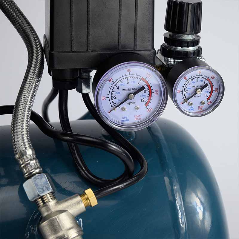 Αεροσυμπιεστής χαμηλού θορύβου με κινητήρα χωρίς λάδι. Με δύο μανόμετρα για ένδειξη πίεσης αέρα καζανιού και εξόδου. Το ελαφρύ καζάνι του σε συνδυασμό με την εργονομική λαβή και το σετ τροχών που φέρει, το καθιστούν εύκολο μεταφορά.